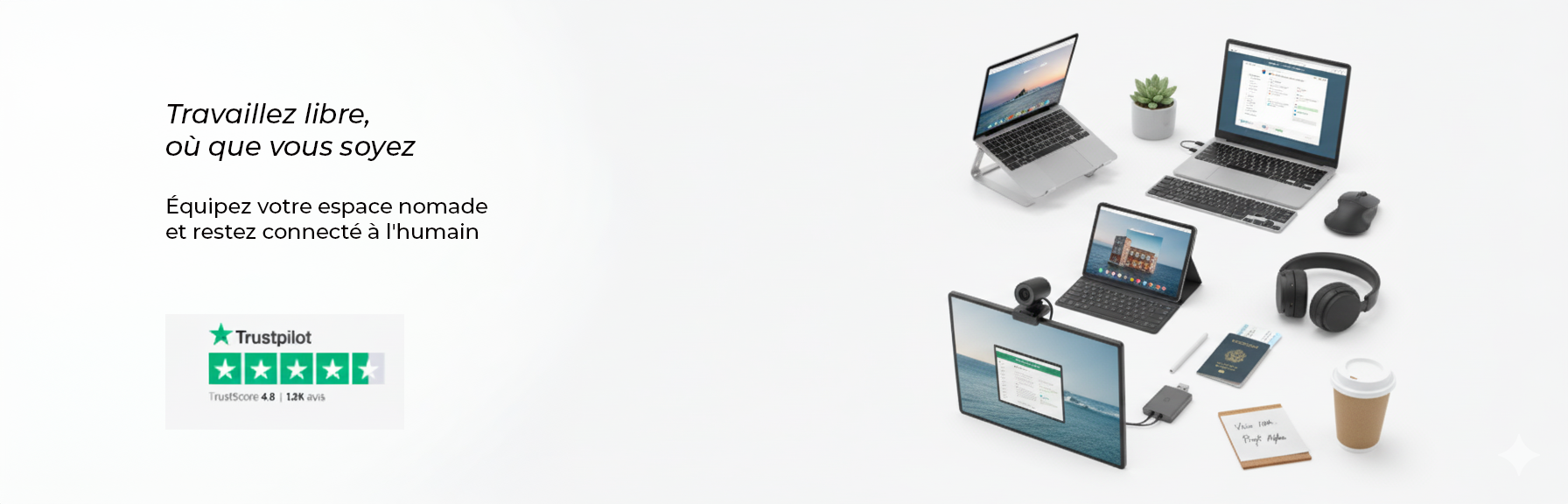 Écran portable, casque antibruit et hub USB‑C pour un setup prêt partout.